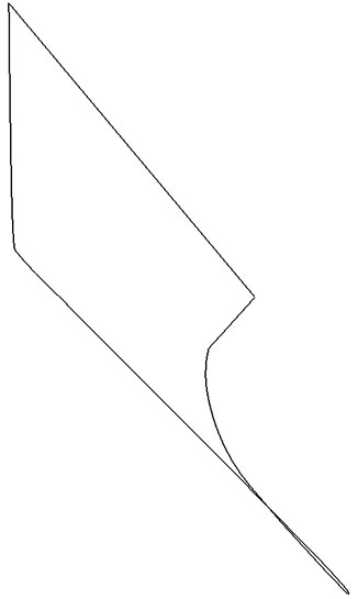 دایره رسم شده نقاطی را روی این خطوط ایجاد میکند که در شکل با نمادهای E'',E',E مشخص است. از 'C تا E قوسی رسم شده است. S=5 cm است. S مقدار مستقیمی است که روی خط ''C'E منظور می شود. دو خط 'E''E و E''E_1 را به تعداد قطعات مساوی (10 تایی) تقسیم می کنیم. قطعات پاره خط E''E_1 برابر 2.845 cm و 'E''E برابر 3.345 cm است.نقاط ایجاد شده را به ترتیب به هم وصل می کنیم.منحنی ما بدست می آید.