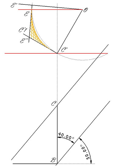 خطی با زاویه ε_0 نسبت به امتداد BC از نقطه 'C به سمت بیرون می کشیم و مقدار R را از آن جدا میکنیم و O می نامیم. دایره مذکور را به مرکز O و شعاع R وارد میکنیم. از نقطه 'C خطی عمود کرده (به سمت داخل) ؛ خطی نیز از همان نقطه با زاویه ε_0 از خط عمود رسم می کنیم. خطی عمود نسبت به امتداد BC بر O رسم میکنیم و مثل قبل از نقطه O خطی با زاویه Δε_0 نسبت به خط عمود قبلی رسم می کنیم.