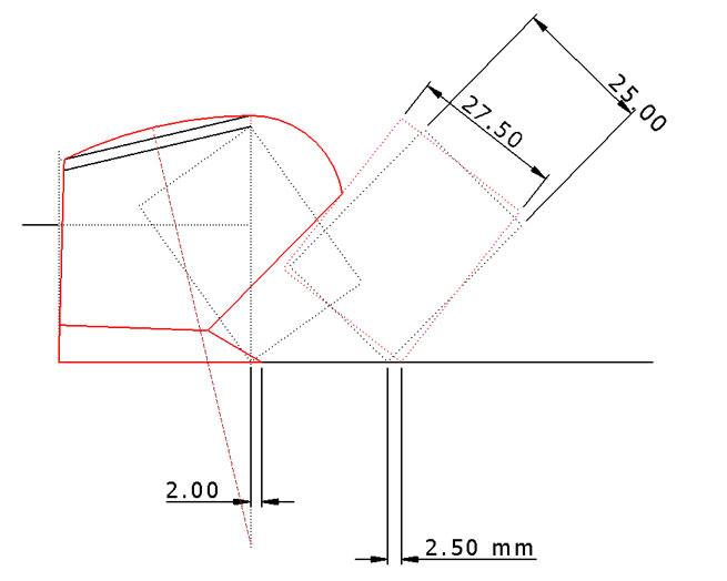 خطی تحت زاویه δ به فاصله « a+b » سانتیمتر از دیواره شیار خطی رسم می گردد. زاویه δ اینگونه حاصل میشود :