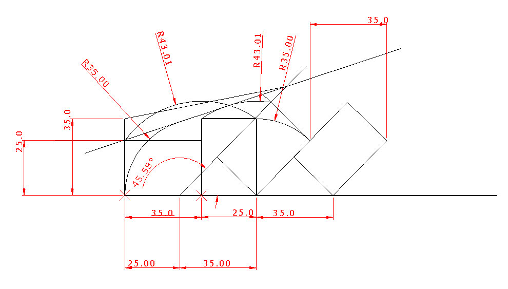 خطی موازی جهت حرکت خیش به فاصله b=35 از آن رسم می کنیم. این خط ، خط ''C نام دارد. خط BC را با زاویه γ_0 نسبت به محور x رسم می کنیم و آن را امتداد می دهیم. نقطه 'C ، دلخواه را روی این امتداد مشخص می کنیم. حال باید دایره ای رسم کنیم. اندازه شعاع دایره اهمیت بسیاری دارد ؛ زیرا مولد و راهنمای اصلی رسم منحنی ماست و تعداد تقسیم بندی های 5 سانتیمتری نمای مقابل خیش و این خط راهنما باید یکسان باشد.من رابطه ای برای افزایش دقت این کار و برای جلوگیری از سعی و خطا ، از هندسه مسئله بدست آوردم که بدین شرح است :