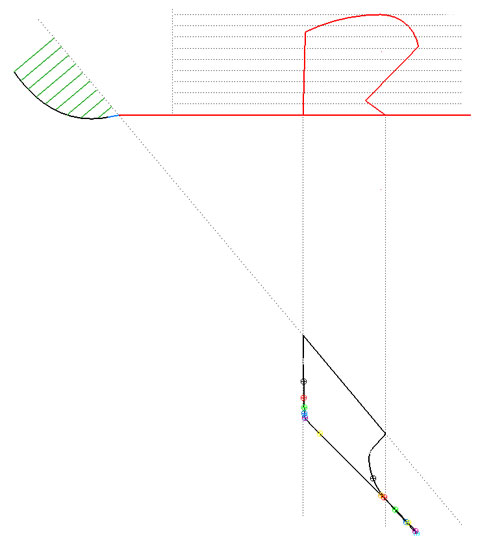 از نمای مقابل نیز خطوطی را از تقاطع خطوط مولد 5 سانتی متری با مرزهای خیش و مرزهای تیغه به سمت نمای افقی رسم می کنیم.این خطوط عمود خطوطی که با زوایایγ_1,γ_2,γ_3,… نسبت به دیواره شیار رسم شده بودند را قطع می کند. با اتصال به ترتیب این نقاط ، شکل افقی خیش حاصل می شود.
