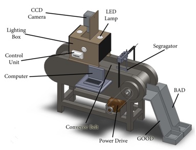 تسمه نقاله توسط یک موتور الکتریکی سه فاز با قدرت 1/49 کیلووات و توسط اینورتر (مدل LG SV-iG5) به حرکت در می آید. در ابتدای تسمه نقاله یک جعبه نورپردازی در بالای تسمه و عمود بر آن و 4 عدد لامپ LED 220 ولت با طول موج نوری 500 تا 700 نانومتر مجهز به 4 عدد فیلم پولاریزه نصب شده است. لامپ ها در چپ و راست تحت زاویه 45 درجه و در بالای جعبه به صورت عمود وظیفه نوردهی هدفمند و با شدت ثابت را بر عهده دارند. این سیستم نوردهی حداقل ایجاد سایه و بازگشت نور را تأمین میکند. به منظور عکس برداری از یک دوربین دیجیتال مجهز به لنز (CCD) (DCR-HC96 Sony) استفاده گردید. دوربین با فاصله کانونی 6/40 تا 406 میلی متر در 53 سانتی متری بالای تسمه نصب شده است و دقتی معادل 2 مگا پیکسل (با قدرت تفکیکی 640 در 480) تأمین میکند.