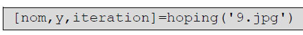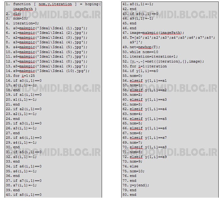 برای ایجاد شبکه، تابع زیر (با نام «hoping») با ورودی آدرس تصویر عدد نمونه و خروجی پیش بینی، خروجی شبکه و تعداد تکرار طی شده در محیط متلب کد نویسی شد؛ البته تمامی صفر ها در ماتریس هدف تبدیل به 1- شدند: